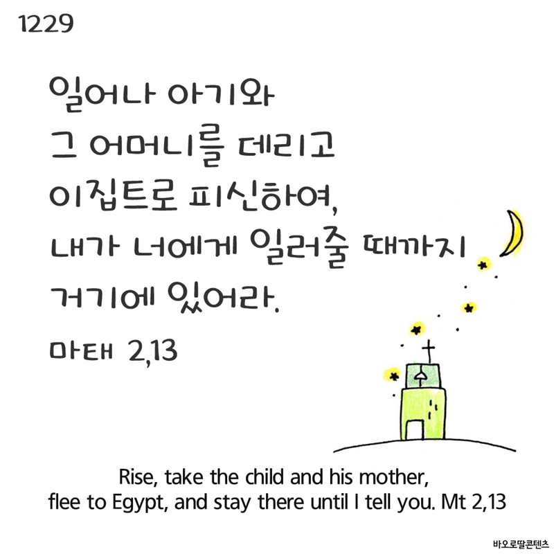 “일어나 아기와 그 어머니를 데리고 이집트로 피신하여, 내가 너에게 일러 줄 때까지 거기에 있어라. 헤로데가 아기를 찾아 없애 버리려고 한다.”(마태 2, 13)