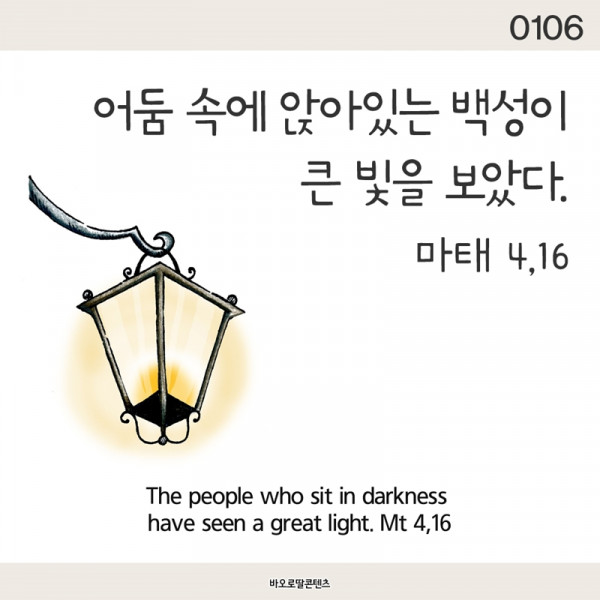 작금의 사회를 보면 참으로 빛 보다는 어둠이 지배하는 사회처럼 느껴집니다. 생명보다는 죽음의 문화가 지배하는 사회처럼 보입니다. 이러한 절망의 사회를 바라보며 또 그 사회의 일원으로 살아가면서도 좌절하지 않고 절망하지 않는 이유는 오늘의 말씀인 “즈불룬 땅과 납탈리 땅, 바다로 가는 길, 요르단 건너편, 이민족들의 갈릴래아, 어둠 속에 앉아 있는 백성이 큰 빛을 보았다. 죽음의 그림자가 드리운 고장에 앉아 있는 이들에게 빛이 떠올랐다.”(마태 4, 15 -17)는 말씀에 대한 믿음 때문입니다.