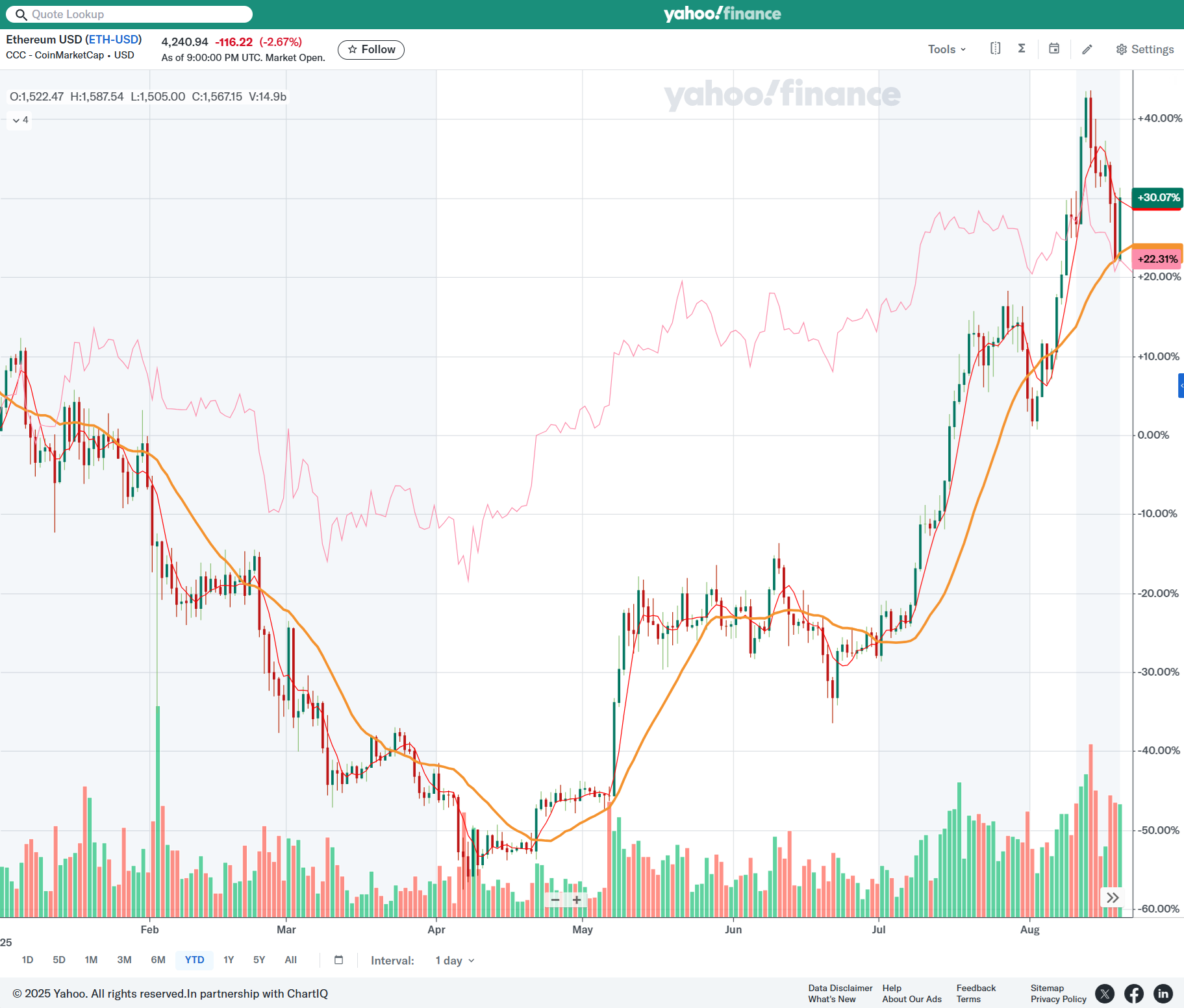 ㅇ 최근 하향세를 보이던 이더리움은 5일 만에 상승 후 상승 분 반납 -3.1% 4,214 기록 중