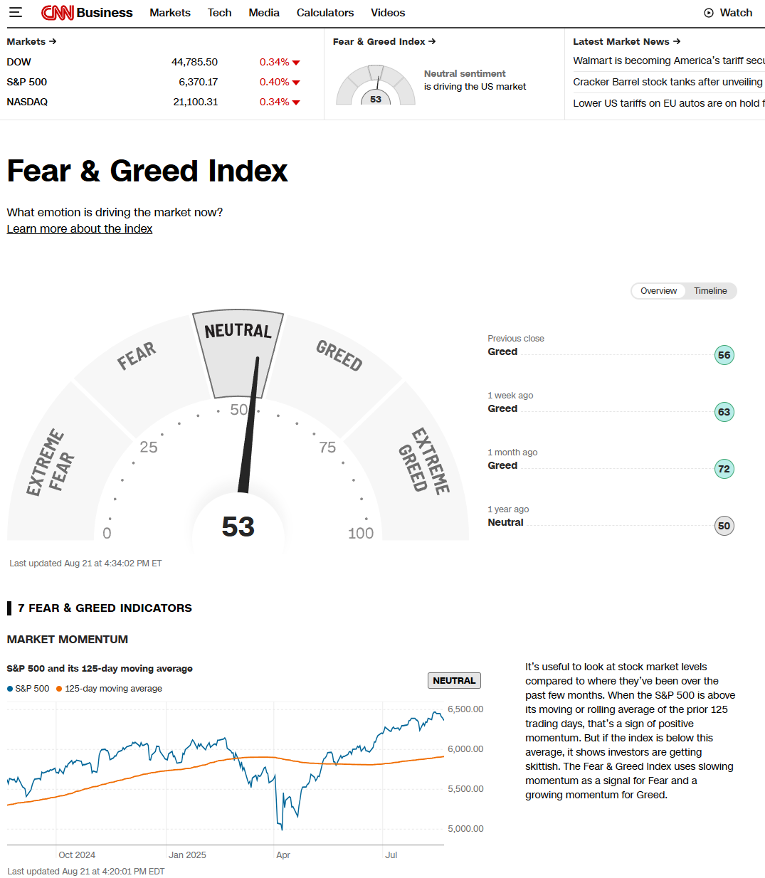 ㅇ Fear & Greed 지수 : 53(-3), 탐욕 구간에서 중립으로 이동