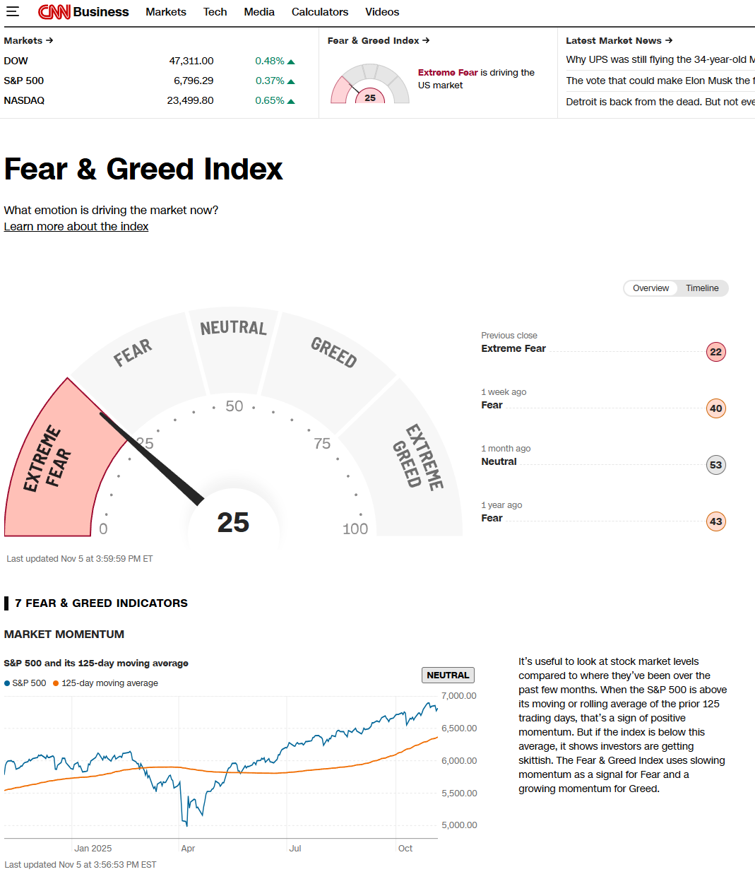 ㅇ Fear & Greed 지수 : 25(+3) 극도 공포 구간 유지
