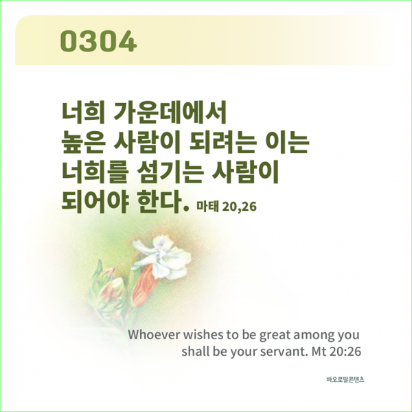 너희 가운데에서 높은 사람이 되려는 이는 너희를 섬기는 사람이 되어야 한다. 마태 20,26